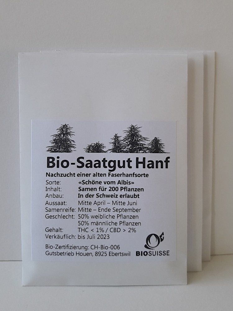 Die Hanfsorte "Schöne vom Albis" stammt aus der Nachzucht einer alten europäischen Faserhanfsorte, die aus dem Saatguthandel verschwunden ist. Sie wird seit 2012 am Albis weitervermehrt.